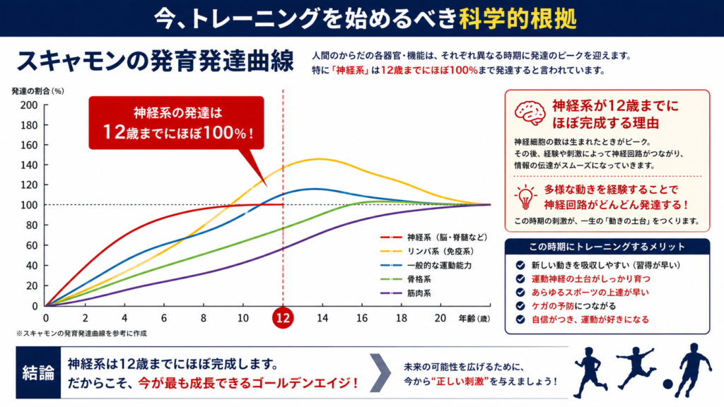 - 12歳までに神経系はほぼ100%完成する 「スキャモンの発育発達曲線」が示す通り、神経系は5歳までに約80%、12歳(小学校卒業時)にはほぼ大人と同じレベルまで発達します。この一生に一度しかない「ゴールデンエイジ」を逃さないことが、お子様の将来の可能性を広げます。